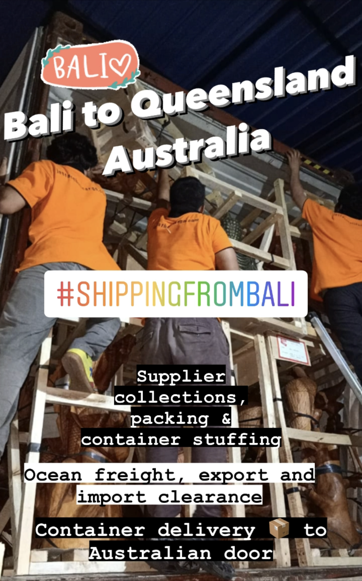 Hassle-Free Bali Freight Service Door to Door Service’s Available ✔️Supplier Collections ✔️Consolidation, Wrapping and Crating ✔️Fumigation to Australian Standards ✔️Export Permits, Clearance, and Documents. ✔️Container Stuffing ✔️Sea-freight ✔️Australian Customs & Quarantine Clearance ✔️Collection from Port and delivery to Consignee’s Door.